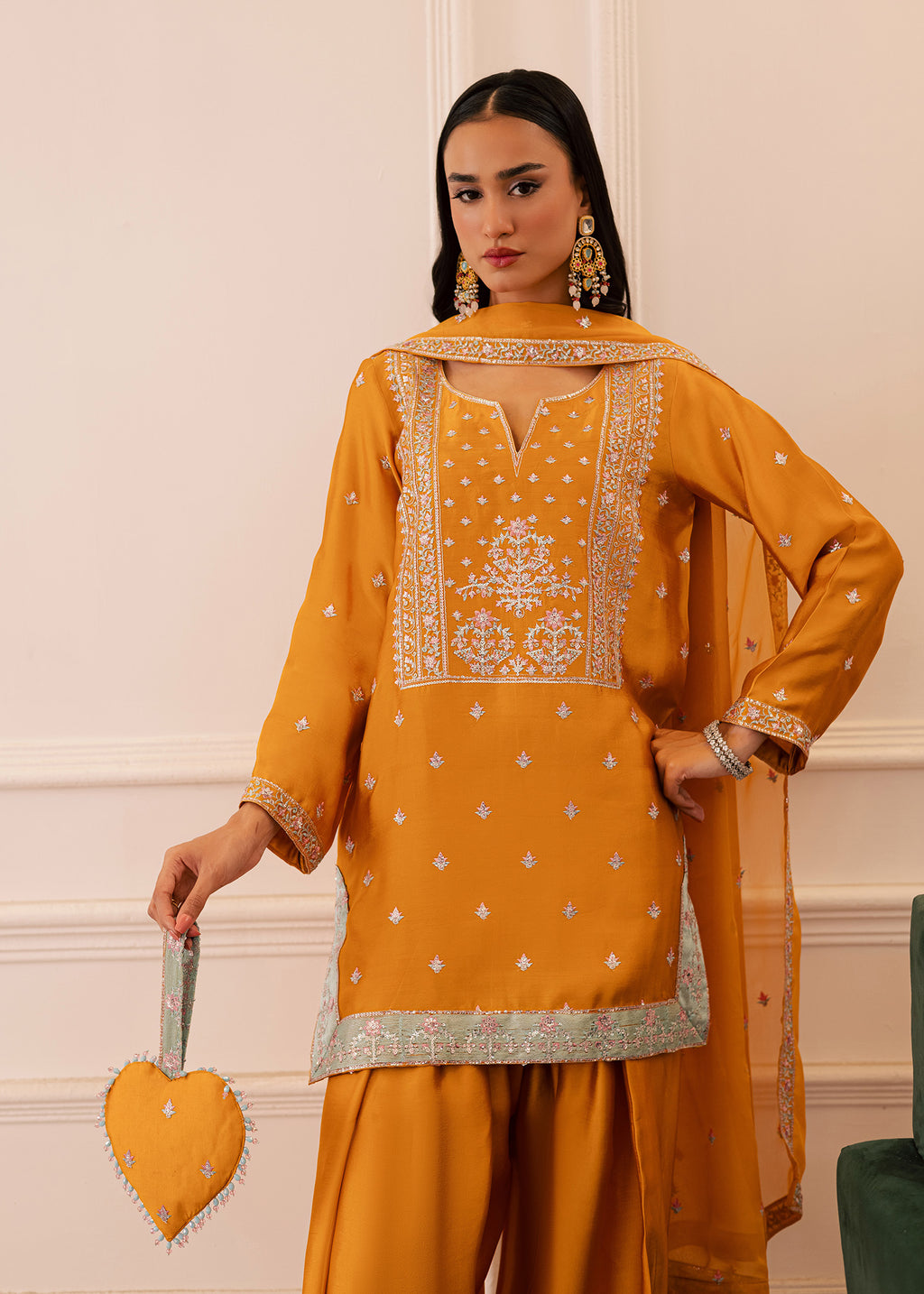 The straight-cut shirt carries intricate embellishment motifs along the neckline, sleeves, and hem, finished with a soft pastel-hued embroidered border that adds a touch of elegance and subtle contrast. Paired with farshi shalwar, the silhouette drapes gracefully, offering both comfort and sophistication. The matching chiffon dupatta, sprinkled with delicate motifs and edged with a coordinated border, completes the outfit with ethereal finesse. This outfit strikes the perfect balance between traditional charm and modern elegance. The vibrant color brings joyful energy, while the fluid silhouette keeps you effortlessly graceful—an ideal choice for mehndi, mayoun, festive dinners, and family celebrations