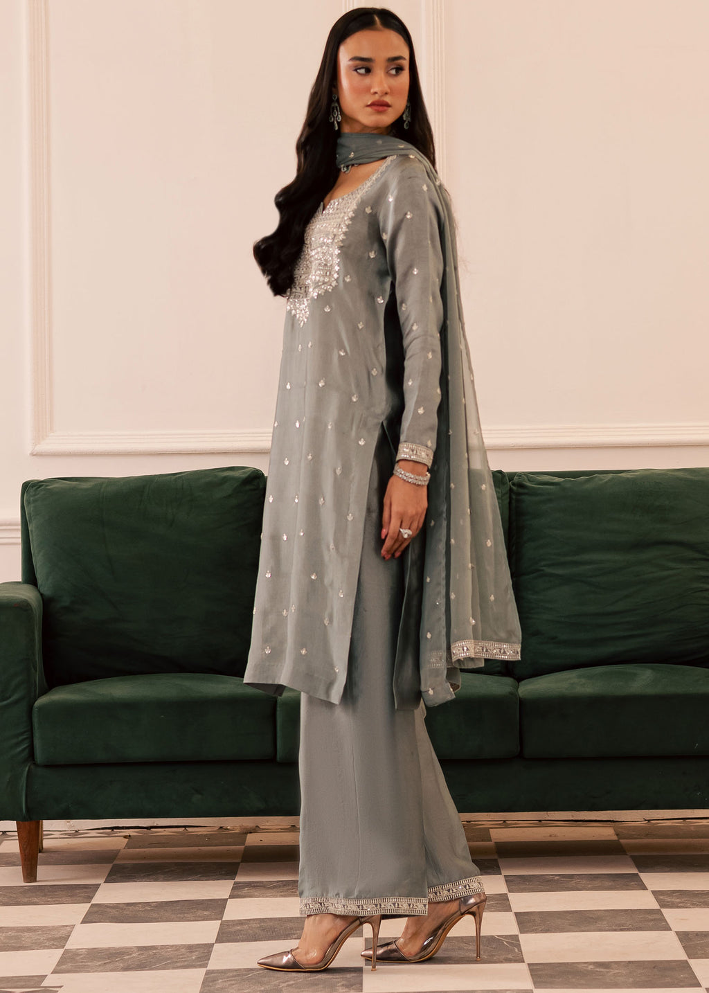 A statement in quiet sophistication — this three-piece outfit is designed in an ash grey tone, offering an elegant and calming aesthetic. The straight-cut shirt features detailed embroidery across the bodice, highlighted with delicate threadwork and shimmering accents that add subtle luxury without overpowering the look.