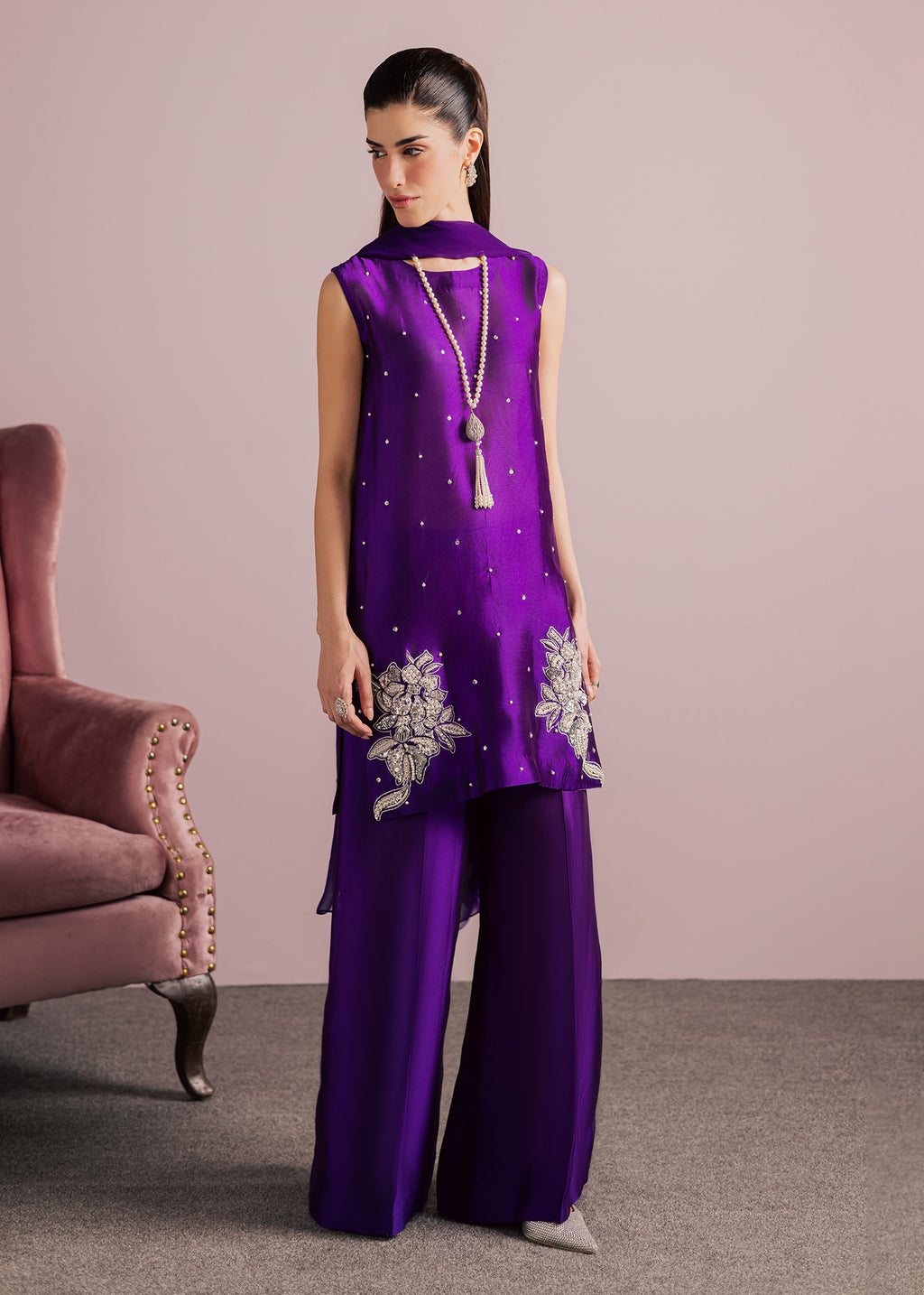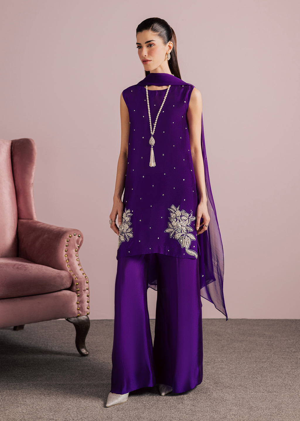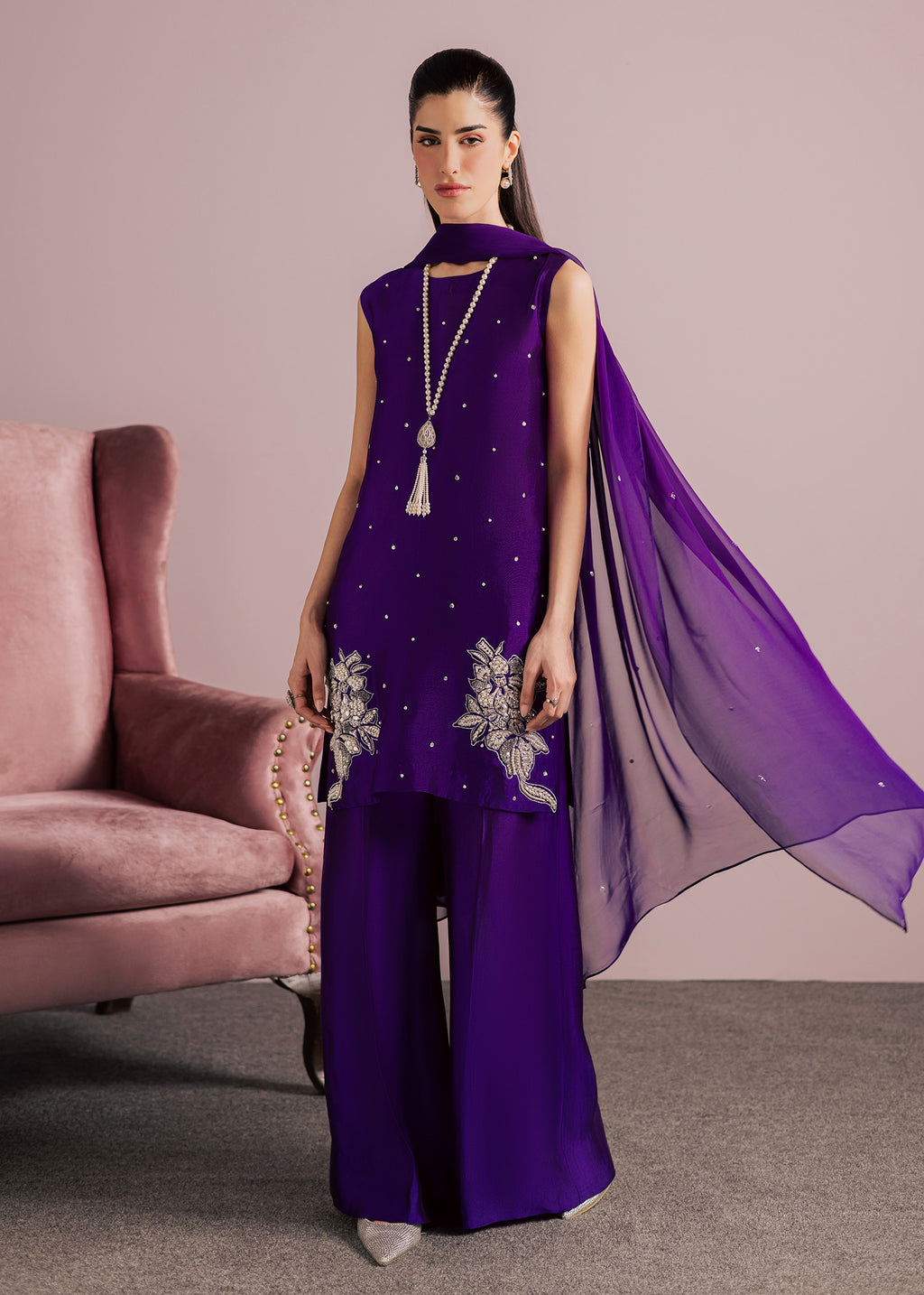 Bold, refined, and effortlessly elegant, this striking ensemble is crafted in a rich jewel-toned plum purple, designed to make a statement while maintaining a graceful, modern silhouette. The top features a clean, tailored cut that elongates the frame, offering a contemporary take on classic festive wear.