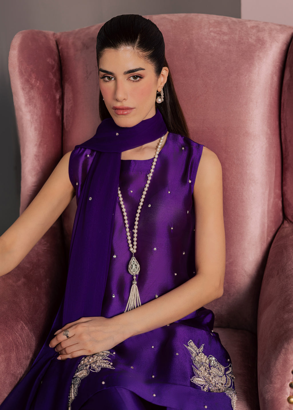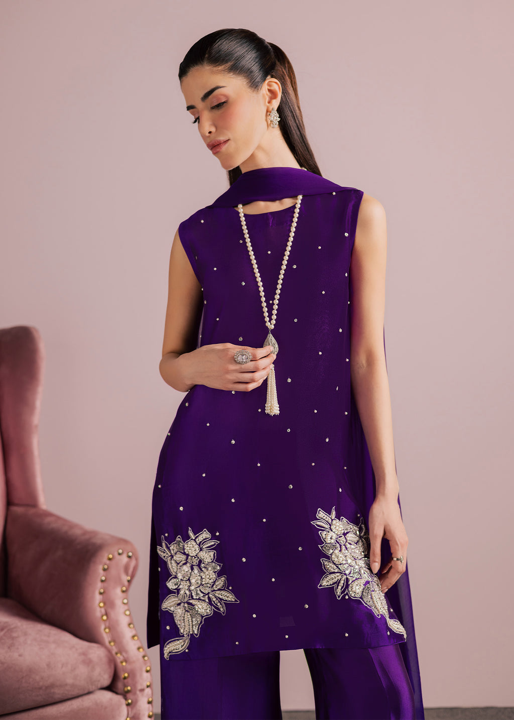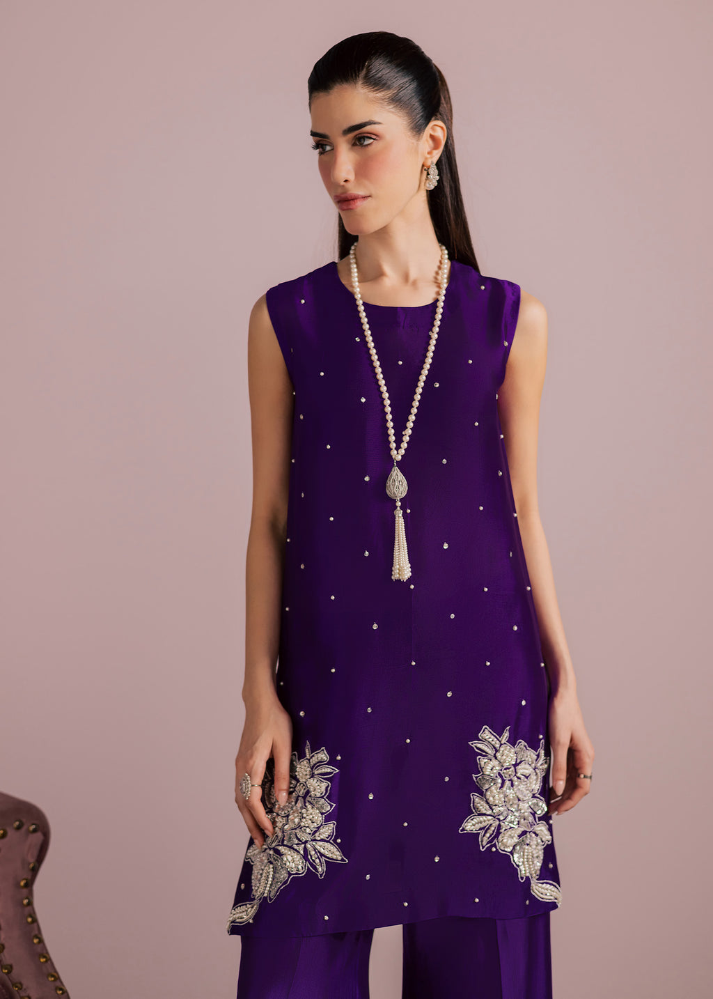 Bold, refined, and effortlessly elegant, this striking ensemble is crafted in a rich jewel-toned plum purple, designed to make a statement while maintaining a graceful, modern silhouette. The top features a clean, tailored cut that elongates the frame, offering a contemporary take on classic festive wear.
