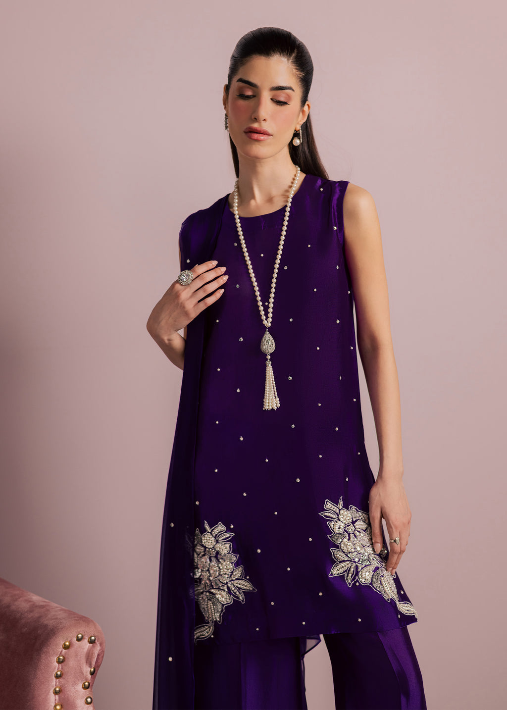 Perfect for evening gatherings, festive celebrations, and formal occasions, this outfit embodies modern sophistication through its rich color, thoughtful tailoring, and delicate hand embellishment.