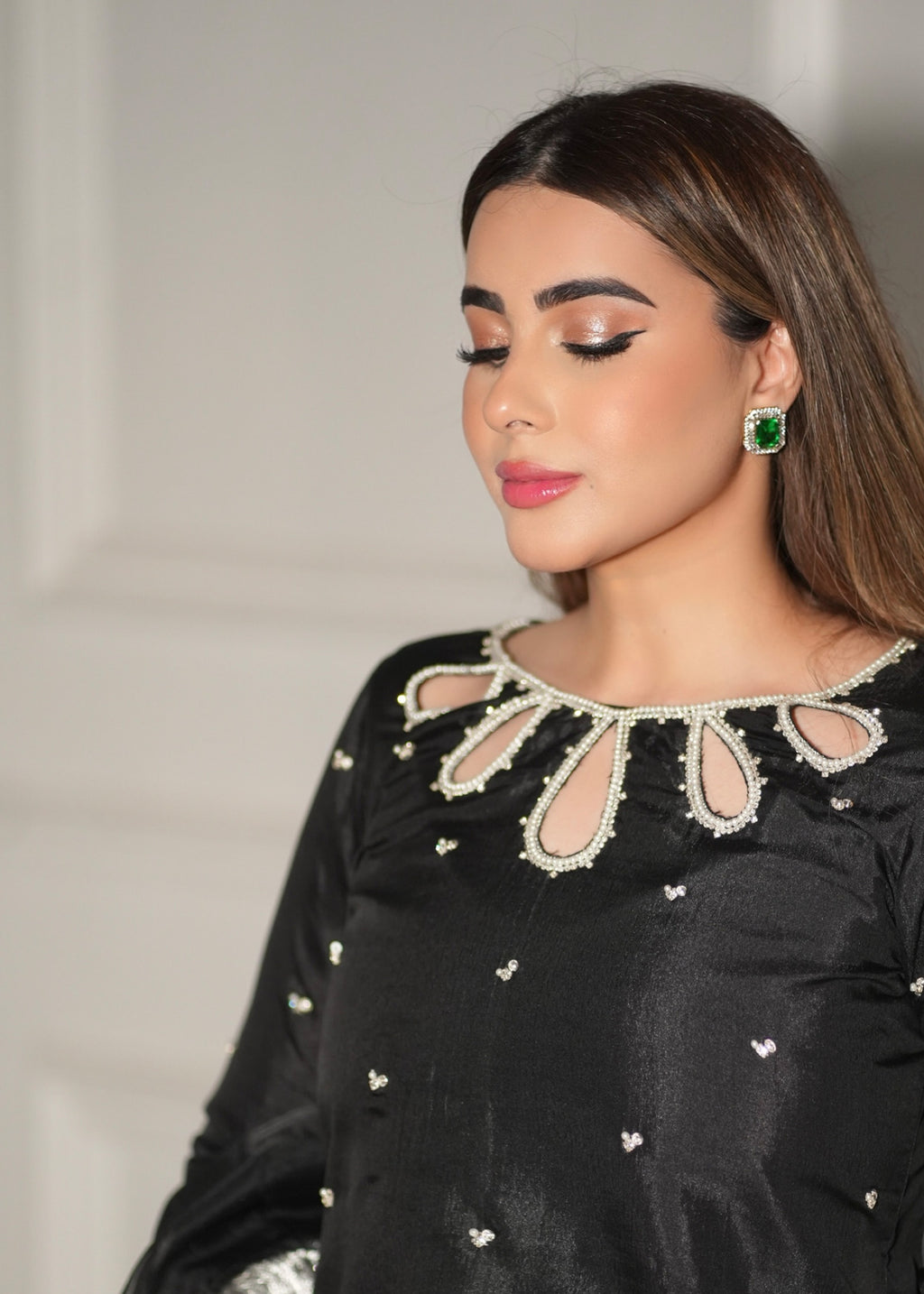 A gorgeous black long shirt adorned with silver and pearl embellishments around the neckline and along the front, paired with straight pants and a flowy dupatta featuring exquisite lace detailing.