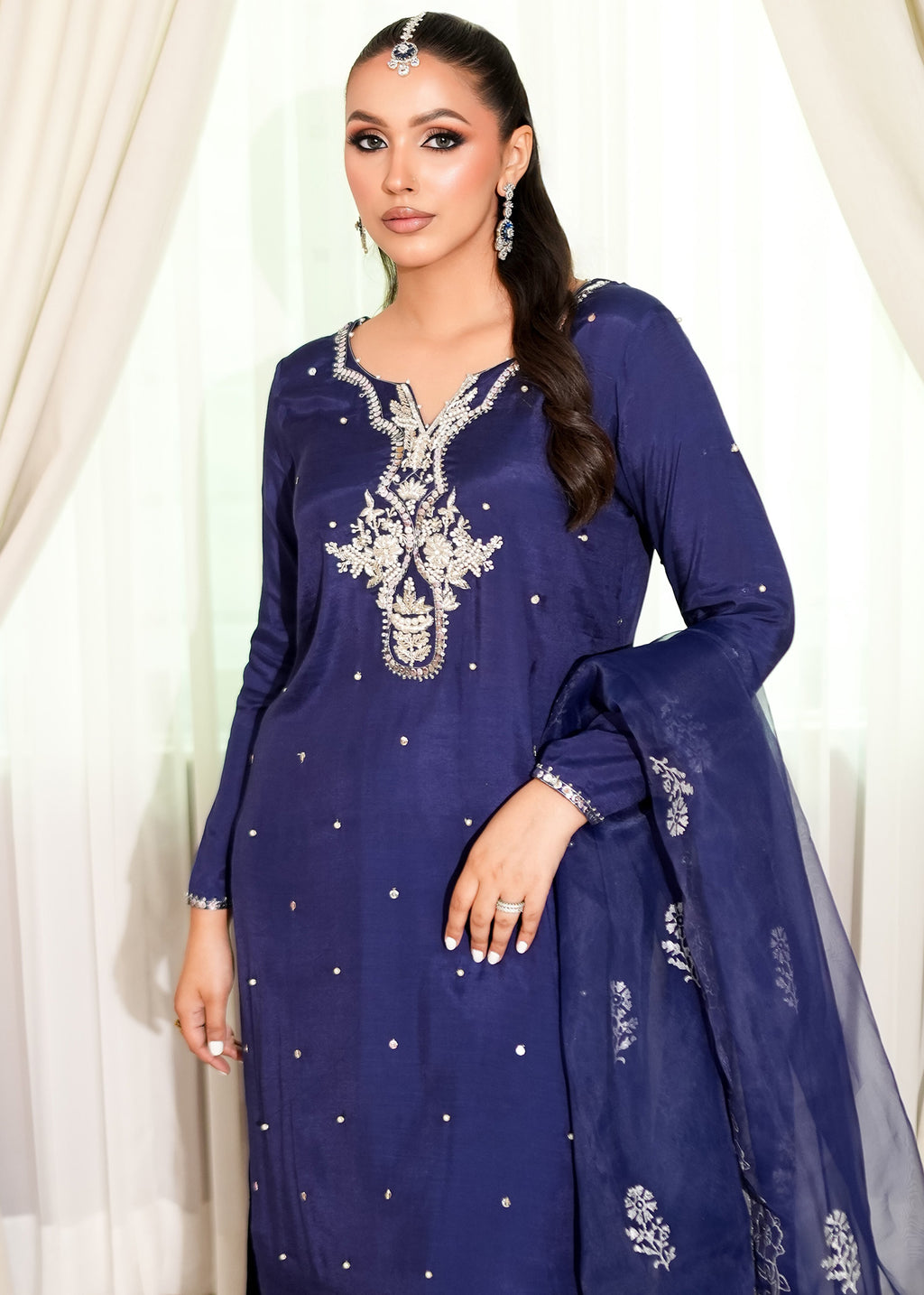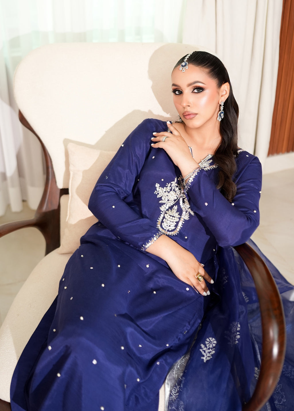 Step into refined elegance with this 3-piece luxury pret ensemble in a dreamy deep blue shade. The shirt, crafted from delicate hand work , features a beautifully designed front adorned with a blend of modern and traditional embellishments, showcasing a sophisticated fusion of styles. Paired with straight pants in premium silk, the silhouette is both graceful and contemporary. The look is completed with a soft, flowing organza dupatta, subtly enhanced with a block print borders and chatta.
